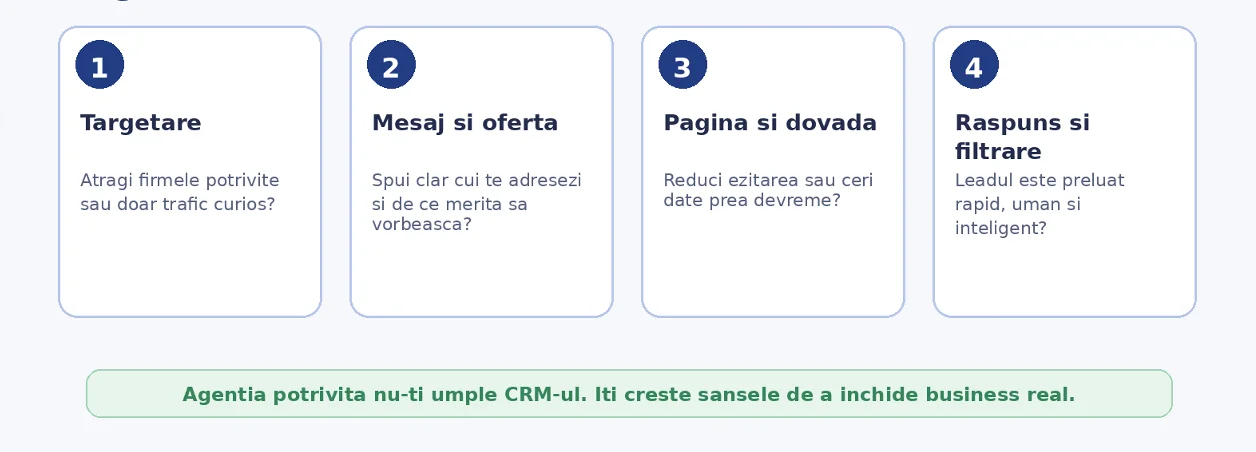 O agentie buna nu incepe cu platforma, ci cu businessul. Intelege oferta, marja, ciclul de vanzare, obiectivele comerciale si ce tip de lead chiar merita timpul echipei tale. Dupa aceea lucreaza la pozitionare, la claritatea mesajului, la structura paginii si la modul in care leadul este preluat.